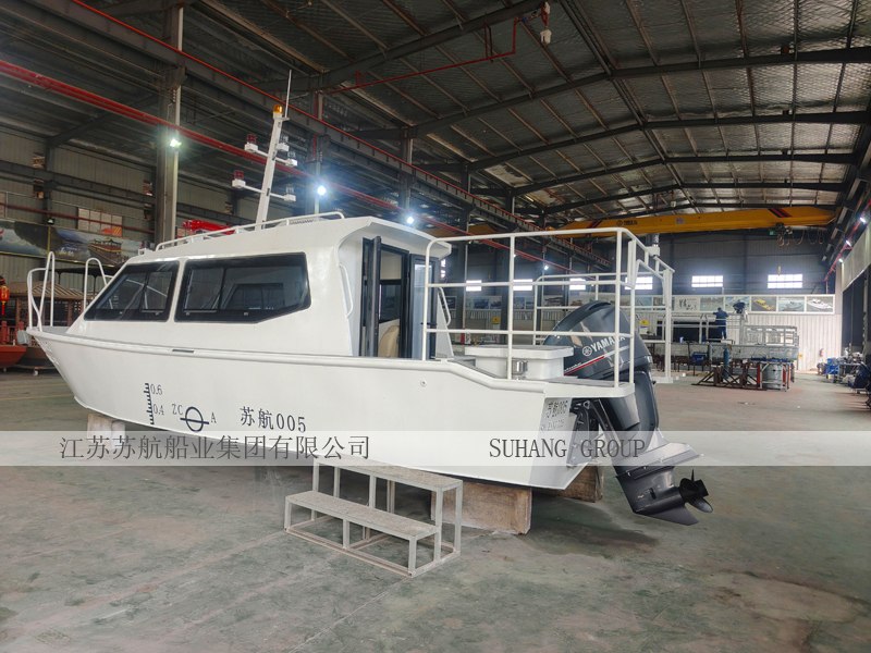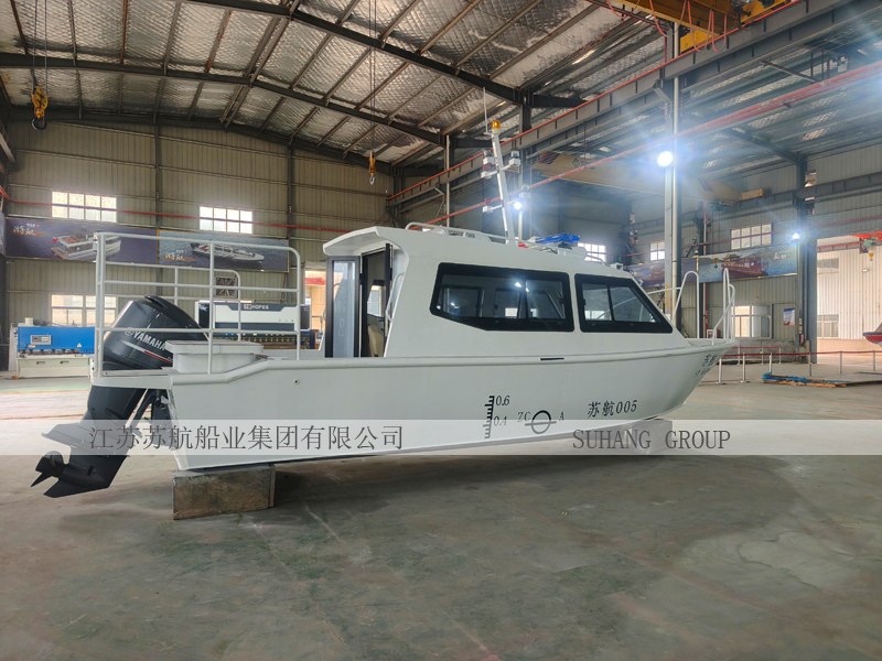 此款公务巡逻艇采用铝合金全焊接,半棚结构,常规动力为雅马哈燃油机动力,也可配备电动动力系统:包含电动船外机、船用锂电池、操控系统等。铝合金巡逻艇因质轻硬度高、抗腐蚀性强、使用寿命长、速度快、灵活、维护成本低等优点,广泛用于公务船领域。