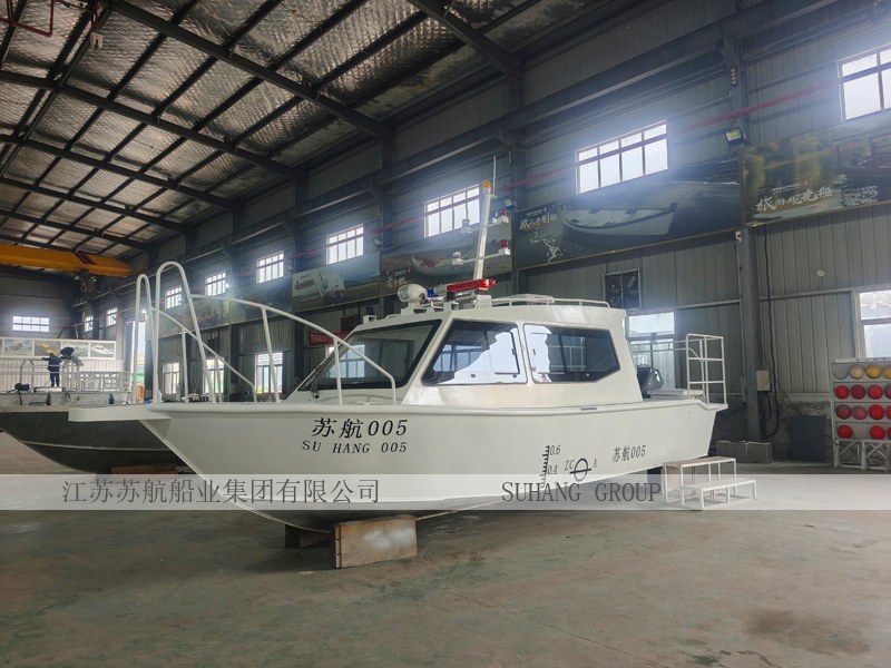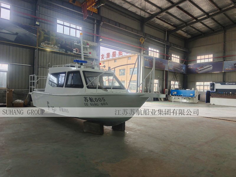 7.5米铝合金公务巡逻艇集成了智能安防监控系统、自动喊话器,主要用于公务执法、巡逻等。