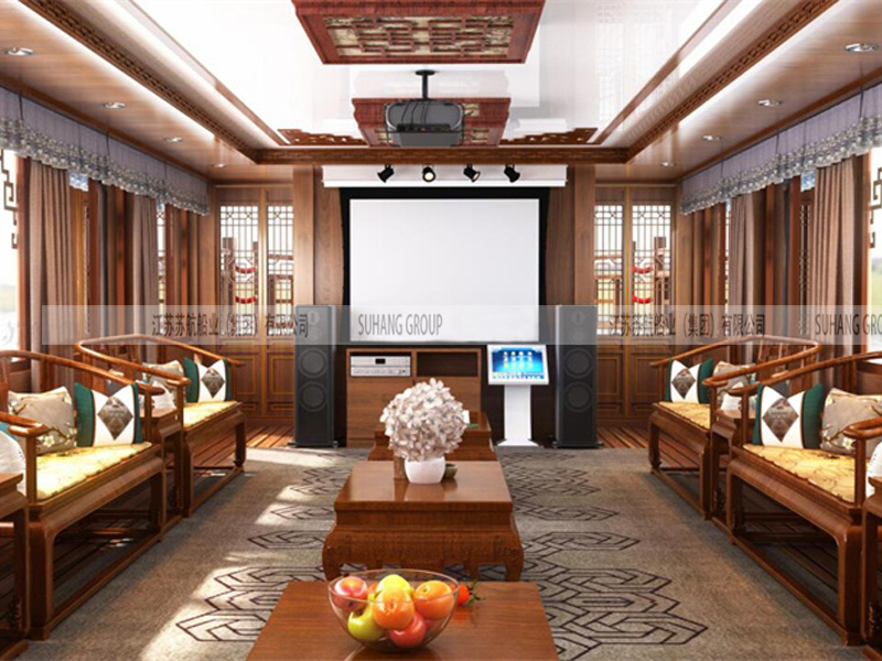 此款22米景区接待画舫船采用双层画舫船结构设计,驾驶舱跟接待舱分离。接待舱内音响、投影仪、卫生间、KTV点歌台等设施一应俱全。二层单独一个包间,可以用作餐饮接待。大面积围栏露台,可以让乘客更好地接近大自然,享受自然的美景。楼台也可以用于巡回演出、节目表演等活动。