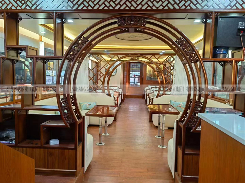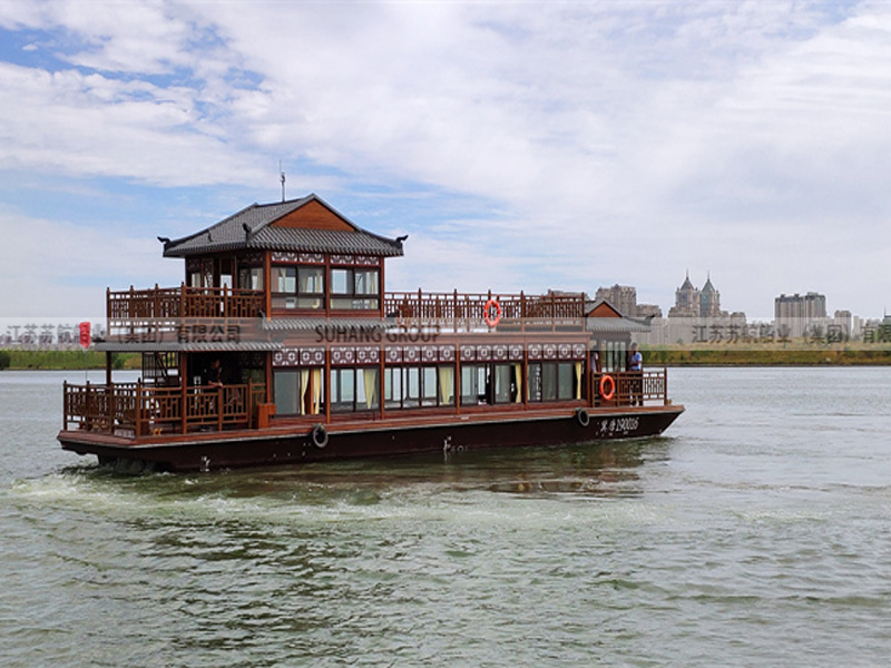 商务接待画舫船(景区接待船)是以招待服务为主的画舫船,通常用于观光和接待活动。商务接待画舫船的设计融入了古代建筑风格,船上的建筑如亭台楼阁,飞檐翘角,玲珑精致。它们通常装饰华丽,内部设施齐全。